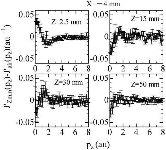 Differences of Compton profiles, ΔJ(pz), in Equation (9) are shown in Figure 3. The difference Compton profile between the propane and air (z = 2.5 mm) shows positive value around pz = 0 au. This indicates that the Compton profile of the propane has a rather acute shape than compared to air. The difference in Compton profiles at z = 15 mm and 30 mm show negative values around pz = 0 au, which indicates that the Compton profiles at z = 15 mm and 30 mm have rather obtuse shape than compared to air.