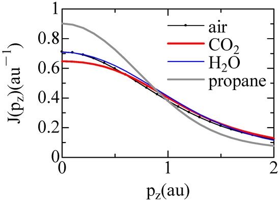 This situation can be understood from theoretical calculations of Compton profiles relative to air, propane, H2O, and CO2 by Crystal14 code [10], as shown in Figure 4, in which the Kohn–Sham DFT Hamiltonian with the basis function of the STO-3G was used. Here, molecular directions are spherically averaged. The calculated Compton profiles are normalized to have a unit area. The Compton profiles of propane and CO2 have rather acute and obtuse shapes, respectively, than compared with air, which are consistent with Figure 3. This indicates that the obtuse shapes of the Compton profiles at z = 15 mm and 30 mm are ascribed to the feature of the Compton profile for CO2 molecules.