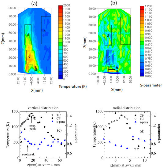 Temperatures and s-parameters of the laminar diffusion flame shown in Figure 5a,b. Propane molecules in region a collapses, which immediately coincides with soot generation in region b. The temperature increases up to 1500K and s-parameter decreases in region c where the combustion filed is dominated by CO2 generation. Afterwards, the combustion gas mixes with air in region d. The temperature decreases and s-parameter converges to the value of the air (region e).