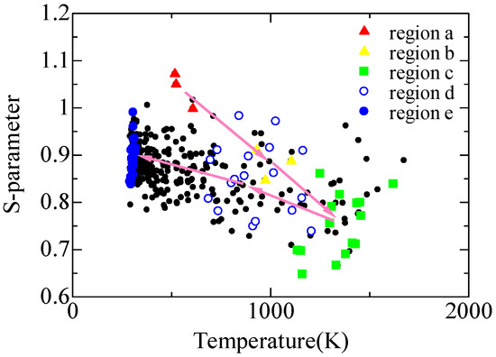 Figure 6 shows a relation of temperature in Figure 5a and s-parameter in Figure 5b. The propane molecules just prior to the combustion in region a (temperature 500 K) induces combustion reactions and immediately collapses in region b, coinciding with soot generation (temperature 1000 K). The temperature increases up to 1500 K and s-parameter decreases in region c. The decrease in the s-parameter corresponds to the obtuse shape of Compton profiles, which reflects a large amount of CO2 generation. Afterwards, the combustion gas mix with air in region d. The temperature decreases and s-parameter converges relative to the value of the air (region e).
