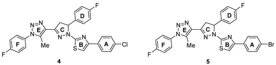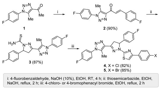 Compounds 4 and 5 were synthesized using a multi-step reaction from 1-(1-(4-fluorophenyl)-5-methyl-1H-1,2,3-triazol-4-yl)ethanone (1) via 3-(4-fluorophenyl)-1-(1-(4-fluorophenyl)-5-methyl-1H-1,2,3-triazol-4-yl)prop-2-en-1-one (2) and 5-(4-fluorophenyl)-3-(1-(4-fluorophenyl)-5-methyl-1H-1,2,3-triazol-4-yl)-4,5-dihydro-1H-pyrazole-1-carbothioamide (3) as intermediates. Reaction of 3 and 2,4’-dibromoacetophenone or 2-bromo-4’-chloroacetophenone under reflux in ethanol (EtOH) produced 4-(4-chlorophenyl)-2-(5-(4-fluorophenyl)-3-(1-(4-fluorophenyl)-5-methyl-1H-1,2,3-triazol-4-yl)-4,5-dihydro-1H-pyrazol-1-yl)thiazole (4) or 4-(4-bromophenyl)-2-(5-(4-fluorophenyl)-3-(1-(4-fluorophenyl)-5-methyl-1H-1,2,3-triazol-4-yl)-4,5-dihydro-1H-pyrazol-1-yl)thiazole (5) in 82% or 85% yield, respectively (Scheme 1).