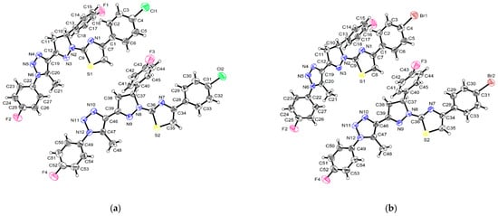 Compounds 4 and 5 are isostructural as evidenced by their similar unit cell parameters and triclinic, PĪ, symmetry (Table 1). The molecules of 4 and 5 comprise linked systems of rings (Figure 1). The rings are chloro/bromo-phenyl [A (C1-C6, Cl1/Br1), (C28-C33, Cl2/Br2)], thiazolyl [B (C7-C9, N1, S1), (C34-C36, N7, S2)], pyrazolyl [C (C10-C12, N2, N3), (C37-C39, N8, N9)], fluorophenyl [D (C13-C18, F1), (C40-C45, F3)], methyltriazolyl [E (C19-C21, N4-N6), C46-C48, N10-N12)] and a second fluorophenyl [F (C22-C27, F2), (C49-C54, F4)].