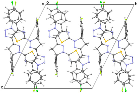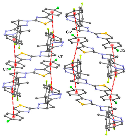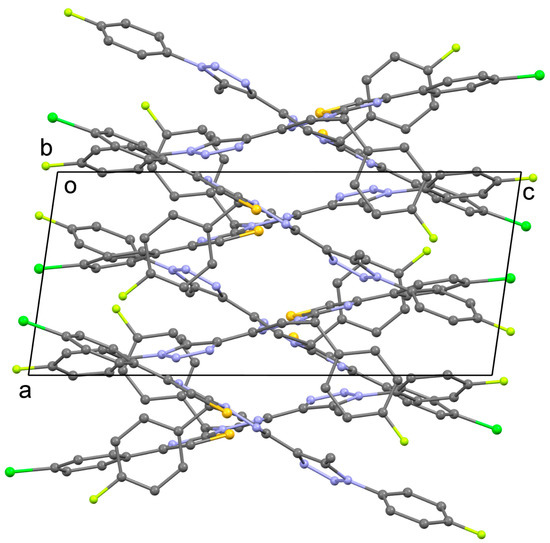 The following discussion applies to the structures of both 4 and 5, although only the former is used for illustration. In the crystals, the molecules are stacked parallel to the a-axis (Figure 3). In the stack, the mean plane of the fragment containing rings A, B, C and E is parallel to (10-1) in one stack and to (201) in the adjacent stack in the direction of the b-axis (Figure 4). Within a given stack, there is very limited π–π interaction between aromatic rings of neighboring molecules. The closest rings in the stack are fluorophenyl/chlorophenyl in 4 (Figure 5) and fluorophenyl/bromophenyl in 5 and the distances between the ring centroids are in the range from 3.73 Å to 4.20 Å (d1–d4 in Table 2). The planes of the rings involved are not parallel and the angles between the rings of neighboring molecules are 12.18° and 14.42° for 4 and the corresponding angles are 12.95° and 13.70° for 5.