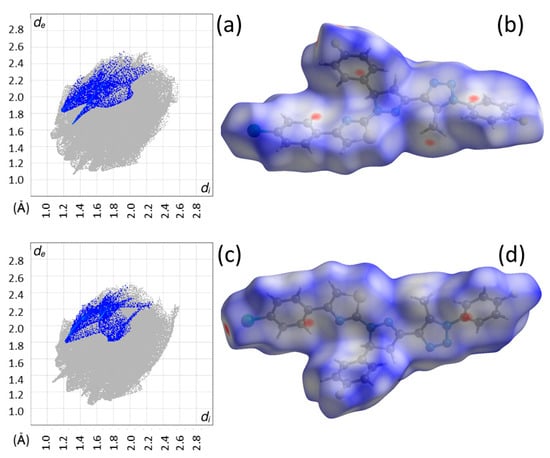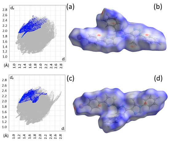 The Hirshfeld surfaces show different intermolecular contacts for the two independent molecules of each structure. The surfaces are shown in Figure 6b,d for 4 and Figure 7b,d for 5. The red regions clearly indicate that the intermolecular contacts are not identical for the two independent molecules of the same structure. Conversely, the contacts are essentially the same for the corresponding molecules in 4 and 5. Highlighted in the fingerprint plots in Figure 6a,c for 4 and Figure 7a,c for 5 are the contributions by chlorine and bromine. The plots follow the same pattern as the Hirshfeld surfaces; the two independent molecules of the same structure show differences whereas comparable molecules from different structures have similar characteristics. The contributions in 4 by Cl are 3.7% and 4.1% for the two independent molecules and 3.9% and 4.2% by Br for 5.