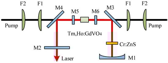 The laser (shown in Figure 1) was designed to be a U-shape resonator that makes it possible to pump a laser crystal from each end of the crystal. The pump beams from two fiber-coupled (400 μm diameter, 0.22 numerical aperture) LDs emitting at ~800 nm were collimated and focused by plano-convex lens (F1, F2) into the active crystal from each end of it. The focused beam radius was 400 μm or 600 μm depending to the focus length of focus len (F1). The output mirror (M2) was a plane mirror with different transmittance (Toc) of 0.20, 0.25, and 0.40 at ~2 μm. The mirror (M1) with the 2000 mm curvature was coated in anti-reflective film at ~800 nm and coated in high-reflective film at ~2 μm. The dichroic mirrors (M3, M4) placing at 45° relatively to the oscillating light path were anti-reflective at ~800 nm and high-reflective at ~2 μm. The distances between M2 and M4, M4 and M3, and M3 and M1 were 35 mm, 60 mm, and 45 mm, respectively. The total cavity length is at 140 mm. To improve the absorbed pump power without crystal fracture, an 8 mm long Tm, Ho: GdVO4 crystal (a-cut) with a 4 × 4 mm2 cross section was chosen as the gain medium with 4at.% Tm3+ and 0.4at.% Ho3+ concentration. The Tm, Ho: GdVO4 was wrapped in indium foil and held in copper heat-sinks connected with a small dewar. During the operating of the laser, the dewar was full of liquid-N2 to effectively remove the heat generated in the crystal for high power operation. The M5 and M6 in Figure 1 denoted the plane windows with anti-reflective film at ~800 nm and ~2 μm. The distance between M5 and M6 is 22 mm. Under the pump laser beam radius of 400 μm or 600 μm, the actual measured absorption efficiency of the Tm, Ho: GdVO4 crystal was over 90%. A Cr:ZnS SA (2 mm thickness, 9 × 9 mm2 cross section) with the unsaturated transmission of ~82% was used as Q-switch crystal placed in a brass heat-sink filled with flowing water. It was inserted between the dichroic mirror M3 and the end mirror M1 with 15 mm distance from the mirror M1.