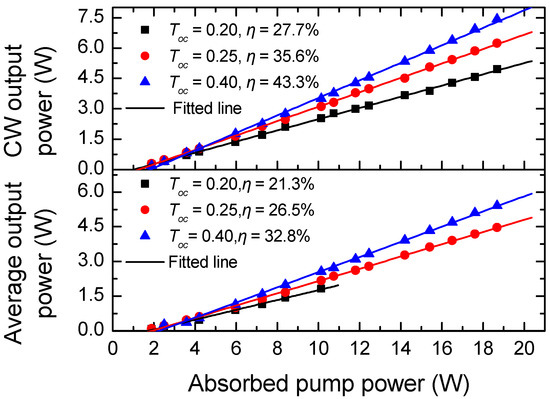 At first, focusing the pump laser beam into Tm, Ho: GdVO4 crystal with a near 400 μm mode radius, we conducted experimental research on Tm, Ho: GdVO4 lasers. Through changing output couplers with different transmittance, the CW and PQS lasers were characterized. To avoid the fracture of gain crystal, the total absorbed pump power did not exceed 18.7 W. The output powers for the CW and PQS lasers were shown in Figure 2 with fitted lines. When the transmittance of OC equals 0.40, the maximum output power for CW and PQS operating mode were achieved to be 7.4 W (η = 43.3%) and 5.4 W (η = 32.8%), η denoted the slope efficiency.