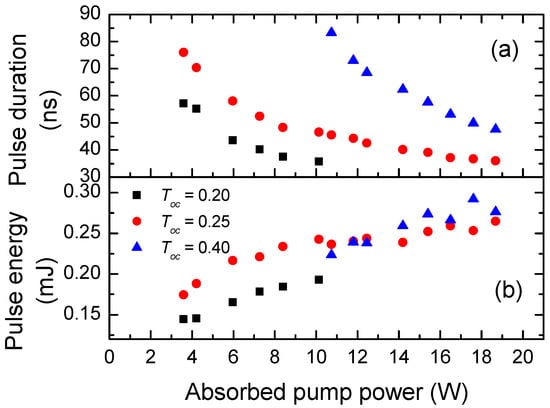 The minimum pulse duration of ~36 ns was achieved for the PQS lasers with a transmittance of 0.20 and 0.25 when the absorbed pump power was increased to the respective maximum value of 10.1 W and 18.7 W, as shown in Figure 3a. The PQS lasers with transmittance of 0.25 and 0.40 generated approximate pulse energy, 0.26 mJ and 0.28 mJ, when the absorbed pump power was increased to 18.7 W, as shown in Figure 3b. The roughly equivalent repetition rates (shown in Figure 4a) were almost increased linearly with the increase of pump power. In comparison, the peak power of ~7.3 kW was achieved for the PQS laser with transmittance of 0.25 at 18.7 W absorbed pump power (shown in Figure 4b), larger than that of other two cavities. Compared with reference [23] with an approximate geometry, the pulse performance was slightly inferior due to the oscillating mode in the resonator.