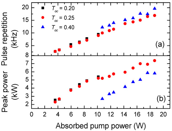 (a) Pulse repetition rate and (b) peak power vs. absorbed pump power.