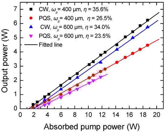 Output power of CW and PQS lasers vs. absorbed pump power.