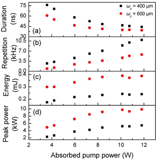 Pulse characteristics of the PQS laser (Toc = 0.25), (a) duration, (b) repetition, (c) energy, and (d) peak power.