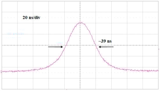 In addition, the maximum absorbed pump power that can exhibit stable Q-switching phenomenon did not exceed 11.8 W which may attribute to the changing of the oscillating laser-mode in the cavity due to thermal effect of laser crystal. The pulse properties of the PQS laser were shown in Figure 6. It is obvious from Figure 6a that the pulse duration is narrower than that of the laser with 400 μm pump mode radium within the total range of absorbed pump power (3.6–11.8 W). The pulse repetition was significantly low varying from 0.8 kHz to 5.7 kHz with the increase of pump power (shown in Figure 6b). The narrowest pulse duration of 39 ns was obtained at the absorbed pump power of 11.8 W with the repetition rate of 5.7 kHz. The maximum energy of 0.39 mJ was achieved at absorbed pump power of 11.8 W (shown in Figure 6c). The maximum peak power is up to 9.9 kW (shown in Figure 6d), evidently greater than that of the laser with 400 μm pump mode radium. At the maximum absorbed pump power of 11.8 W, the single pulse trace were recorded through scattering the laser into a fast PIN photodiode connected to a Lecroy digital oscilloscope (600 MHz bandwidth), as shown in Figure 7. We also measured the emission wavelength of the CW and Q-switched lasers with various output couplers. The output laser wavelength kept in about 2.05 μm.