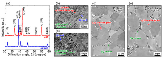 Typical XRD profiles of the as-built and 4ST rods (a) and SEM-BSE images of the as-built (b,c), 2ST (d), and 4ST (e) rods. (b) Enlarged image of the area in the as-built rods containing the α2/β/γ mixed structure and the β/γ cell.
