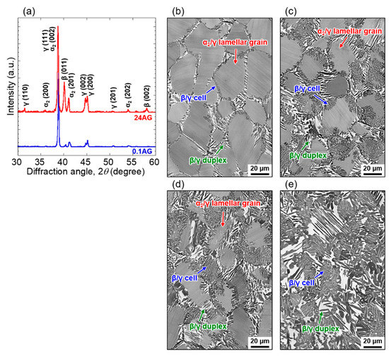 To obtain the α2/γ lamellar structure surrounded by the β/γ cells at the lamellar boundaries, the as-built rods were subjected to a two-step heat treatment process at different temperatures derived from the phase diagram [38]. The first heat treatment step was conducted at 1573 K in the β + α two-phase region, for 2 or 4 h in an Ar atmosphere, followed by air cooling as a solution treatment (ST). Hereafter, the alloys solutionized for 2 and 4 h are referred to as 2ST and 4ST, respectively. The solutionized rods were then subjected to aging (AG) at 1273 K in the β + γ two-phase region, for 0.1, 0.5, 1, or 24 h in an Ar atmosphere followed by air cooling; these aged alloys are referred to as 0.1AG, 0.5AG, 1AG, and 24AG, respectively.