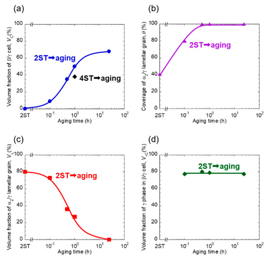 Meanwhile, the volume fraction of the β/γ duplex structure (VDP) increases from approximately 20% to 27% with increasing annealing time from 2 h to 4 h (Figure 2d,e). Since the γ phase is precipitated during air cooling from 1573 K, the β/γ duplex structure observed after cooling corresponds to the β single phase at 1573 K. The volume fraction of the β phase at 1573 K, estimated from the equilibrium phase diagram of the 44-4 alloy according to the lever rule, is approximately 26% [38]. This means that the microstructure of 4ST is almost in thermodynamic equilibrium, whereas 2ST exhibits a non-equilibrium microstructure. The β-stabilizing element (Cr for the 44-4 alloy) diffuses from the α grains to the β phase during the solution treatment when the microstructure approaches equilibrium. Therefore, it is considered that the α2/γ lamellar grains in 2ST contain more solute Cr atoms than their counterparts in 4ST. While the details will be discussed in depth later, a brief comparison of the two solutionized alloys with different concentrations of Cr in the lamellar grains indicates that 2ST is more suitable for aging to form the β/γ cell structure.