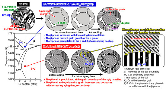 Schematic illustrations of microstructural evolution during solution/aging treatments and cellular precipitation at the lamellar grain boundaries are shown in Figure 5. The α2/γ lamellar structure in which Cr is supersaturated can be obtained by the solution treatment at 1573 K in the β + α two-phase region, followed by air cooling (Figure 5I). When the alloys with the lamellar grains are aged at 1273 K in the β + γ two-phase region, the cellular precipitation reaction takes at the lamellar grain boundaries to reduce the Cr concentration in the grains (Figure 5II). The growth rate (v) of the cellular structure can be expressed by Equation (2) [46],