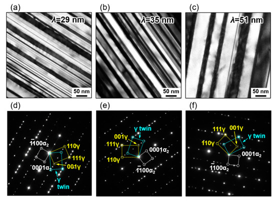 The variation in the volume fraction of the γ phase in the β/γ cells (VγC) is plotted against the aging time, as shown in Figure 4d. In the figure, it can be observed that VγC remains almost constant at approximately 78%, regardless of the aging time. This is because the ratio of the β and γ phases in the cells reflects their equilibrium ratio at the aging temperature. In addition, the morphology of the α2/γ lamellar structure varies with aging time. Figure 6 shows the bright-field (BF) images and selected area electron diffraction (SAED) patterns of the α2/γ lamellar grains in the alloys aged at 1273 K for 0.1–1 h. The SAED patterns indicate that the lamellar grains in the alloys are composed of the fine γ plates with twin boundaries and the fine α2 plates. In addition, the α2 and γ phases have the Blackburn orientation relationship expressed by Equation (1) (Figure 6d–f). The mean lamellar spacing (λ) of 0.1AG is approximately 29 nm, which is comparable with that of the ultrafine α2/γ lamellar grains (approximately 30 nm) in the as-built rods, as reported in a previous study [34]. It is interesting to note that λ increases to approximately 51 nm after aging for 1 h due to coarsening of the γ plates and reduction in the number of the α2 plates. This is because the aging temperature (1273 K) corresponds to the β + γ two-phase region. This minor variation of λ in nano-order size strongly influences the mechanical properties of the alloys.
