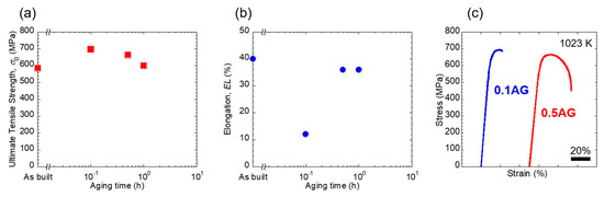 Variations in σB (a) and EL (b) of the aged alloys at 1023 K with aging time and S–S curves of 0.1AG and 0.5AG tensile deformed at 1023 K (c).