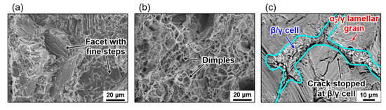 The ultimate tensile strength (σB) and the elongation (EL) at 1023 K of the as-built rods and the aged rods were examined with respect to the aging time (Figure 7). The σB of the as-built alloys is greater than 580 MPa which is higher than that of 48-2-2 alloys fabricated by casting (~450 MPa) [43]. This is because the fine β phase in the α2/β/γ mixed structure and the ultrafine α2/γ lamellar grains act as strengthening factors at the deformation temperature [34]. It should be noted that the high-temperature strength of the alloys was improved by aging at 1273 K. Moreover, there is no mechanical anisotropy in the aged rods. σB of the alloys reaches 697 MPa at 0.1AG and then decreases slightly with increasing aging time. However, it is never less than 600 MPa. As shown in Figure 7b, the as-built rods exhibit EL of approximately 40% at 1023 K, which is much larger than that of the TiAl alloys produced by other processes (less than 10%) [47]. Such a large ductility at deformation temperatures below 1075 K is one of the unique features of the EB-PBF-TiAl alloys with fine microstructures [33,34]. As described earlier, the microstructures of the aged alloys are relatively coarse and completely different from those of the as-built alloys (Figure 2 and Figure 3). As a result, EL of 0.1AG decreases steeply to approximately 10%. Figure 7c shows stress–strain (S–S) curves of 0.1AG tensile-deformed at 1023 K. The 0.1AG fractures shortly after reaching the maximum stress. Moreover, in the fracture surface of 0.1AG, facets approximately 35 μm in size can be seen with fine steps (Figure 8a). Note that the size of facets is similar to that of α2/γ lamellar grains. This distinctive fracture surface suggests that brittle crack initiation at the lamellar interface and crack propagation through the lamellar boundary are responsible for the low ductility of 0.1AG. However, it should also be noted that the ductility of the aged alloys can be recovered by increasing aging time, resulting in a high EL of approximately 36% for 0.5AG and 1AG. In contrast to EL of 0.1AG, that of 0.5AG increases even beyond UTS (Figure 7c). In addition, the fracture surfaces of 0.5AG pulled to fracture at 1023 K are covered by dimples, indicating that the fracture mode changes to ductile fracture (Figure 8b). Figure 8c shows the side-view of the fractured part of the 0.5AG tensile-deformed alloy specimens. It can be noted that the β/γ cells deformed significantly, compared with the α2/γ lamellar grains. This means that the cells deformed preferentially during the tensile loading. Furthermore, the crack propagation in the lamellar grains stops at the β/γ cells, indicating that the cells act as a barrier to the crack propagation.