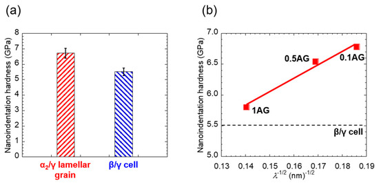 Nanoindentation hardness of the α2/γ lamellar grain and the β/γ cell in 0.1AG (a) and Hall–Petch plot of nanoindentation hardness of the α2/γ lamellar grains in the aged alloys as a function of reciprocal square root of λ (b).