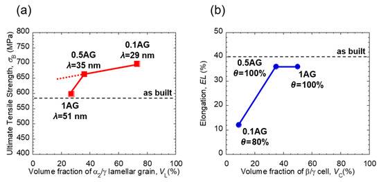 In order to understand the role of the α2/γ lamellar grains and the β/γ cells on the tensile properties of the alloys, the hardness of these structures was measured by nanoindentation tests and the results are summarized in Figure 9a. The hardness of the lamellar grains is found to be much higher than that of the β/γ cells. The lamellar structure is composed of the α2 phase with the D019 structure and the γ phase with the L10 structure with the Blackburn relationship. The lamellar boundaries act as a barrier to the propagation of deformation through the Hall–Petch law. Moreover, there are six crystallographic variants in the γ phase. Therefore, not only the α2/γ boundaries but the γ/γ boundaries can be a strong barrier to the deformation propagation across the boundaries [48]. In addition, the degradation of the α2/γ lamellar grains such as a coarsening of the lamellar spacing cannot be observed in the tensile-deformed specimens, because the lamellar structure has high stability at 1023 K [34]. Therefore, it can be suggested that the α2/γ lamellar grains play a key role in strengthening the alloys. In fact, σ B of the aged rods increases with increasing VL (Figure 10a). However, the strength of 1AG is lower than the value expected from a linear relationship between VL and σB, drawn by a dotted line in Figure 10a. This discrepancy is considered to be attributed to the Hall–Petch relationship between the lamellar spacing and the strength [40,41]. Figure 9b shows the Hall–Petch plot for the nanoindentation hardness of the α2/γ lamellar grains in the aged alloys. The hardness increases with increasing reciprocal square root of λ. In 1AG, the hardness of the lamellar grains exhibits a low value and approaches that of β/γ cells due to high λ, resulting in a low σB.