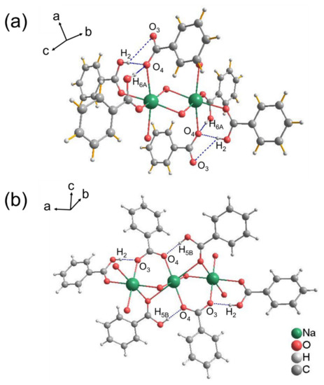 The aim of this study is to use the templating molecules from dissolved co-crystals to guide the co-crystallization of the HBz–NaBz system, so that its variability of stoichiometric ratio and polymorphism may be overcome. Being an ionic co-crystal, 2:1 HBz–NaBz co-crystal is built on the coordination complexes of three kinds: a sodium atom with another sodium atom, a sodium atom with a carboxylic acid ligand, and a sodium atom with a carboxylate ligand and several hydrogen bonds, as illustrated in Figure 2. There are three hydrogen bonds located at H2···O3, H2···O4, H6A···O4 in Form A, as illustrated in Figure 2a [7]. For Form B, two hydrogen bonds are present: H2···O3 and H5B···O4, as shown in Figure 2b [8]. To our best knowledge, no crystallographic data for 1:1 HBz–NaBz co-crystal have been published. Presumably, crystal packing also consists of sodium coordination complex(es) and hydrogen bond(s).