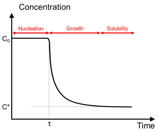Nucleation and growth determination by concentration measurement: In studying the nucleation rate, the induction period is an important parameter to obtain. The induction period is commonly determined by visual confirmation of crystal appearance, such as eye [26], focused beam reflectance measurement [28], and turbidimeter [29,30,31]. Another method is by indirectly measuring the concentration change in the solution over time. Solute concentration can be measured by various means, such as density [32], refractive index [33], electrical conductivity [24], and ultrasound [34], resulting in the desupersaturation curve as illustrated in Figure 3. The induction time would then be determined based on the plateau region. In this study, an off-line UV-Vis spectrometer was used as the main tool to measure the concentration of 2:1 HBz–NaBz co-crystal over time. The induction time would also be visually verified by off-line optical microscopy.