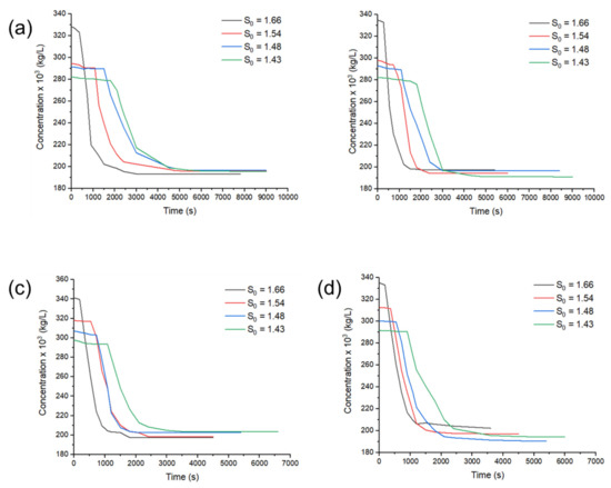 Representative desupersaturation curves of co-crystallization of 2:1 HBz–NaBz co-crystals at different S0 values of 1.66, 1.54, 1.48, and 1.43 (a) without templating molecules addition, (b) with dissolved NaBz templating molecules addition, (c) with dissolved 2:1 HBz–NaBz co-crystal templating molecules addition, (d) with dissolved 1:1 HBz–NaBz co-crystal templating molecules addition.