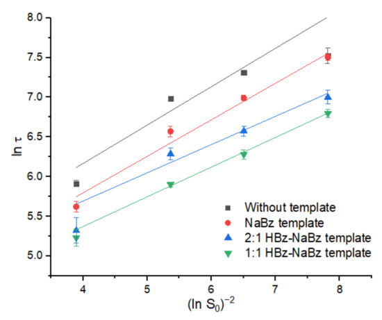 Plots of (ln S0)−2 vs. ln τ of co-crystallization of 2:1 HBz–NaBz co-crystal with and without templating molecules fitted to Equation (12) based on the data in Table 1.