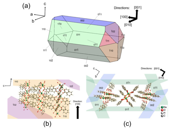 The theoretical crystal morphology of 2:1 HBz–NaBz co-crystals is depicted in Figure 8, determined based on Bravais–Friedel–Donnay–Harker (BFDH) theory. According to this theory, the most morphologically important faces are the one with the largest interplanar distance (dhkl). For 2:1 HBz–NaBz co-crystals with monoclinic lattice and 2/m symmetry [8], it was determined that those faces were (011), (002), (–102), (110), and (11–1). Superimposition of these faces onto the co-crystal packing configuration revealed that coordination complexes of sodium with another sodium atom formed elongated “chains” along [100] direction (Figure 8b), while several of these “chains” formed a discrete pattern along [010] and [001] directions (Figure 8c), weakly interconnected possibly by van der Waals forces.