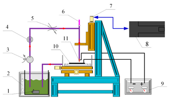 Schematic image of JED experimental device, 1 Submersible pump, 2 Thermostatic apparatus, 3 Circulating pump, 4 Flowmeter, 5 Throttle, 6 Thermometer, 7 Servo motor, 8 Numerical control device, 9 Power source, 10 Cathode, 11 Anode.