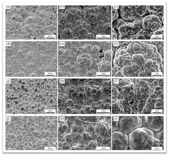 (2) The effects of deposition voltage on the corrosion resistance. In the electrodeposition deposition process, deposition voltage has an important influence on the morphology and grain size. Increasing the voltage in a suitable range is conducive to refine the grain size and improve coating properties [29,30,31]. In the previous description of the sample morphology, the increase in the deposition voltage had reduced the pores and the gaps between the grain boundaries and improved the compactness of micro-nano structure. Those changes on the sample surface are good for improving the corrosion resistance. Therefore, when the voltage parameters are different, the electrochemical properties of the sample are different.