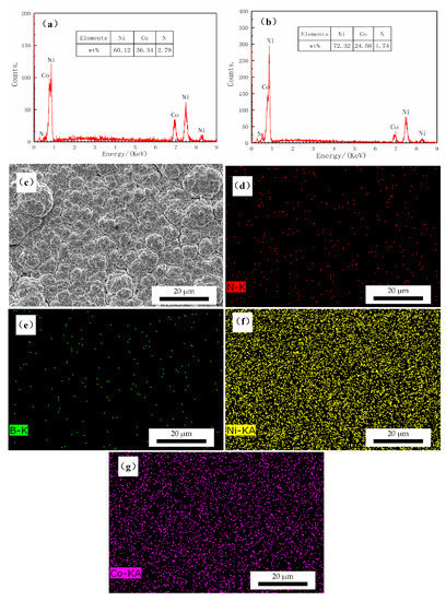 Figure 4 is the EDS spectrums and elemental maps of samples. Figure 4a,b show the contents of Ni, Co and N in the basic coating and the secondary coating. The changes of element content in the samples were mainly caused by the changes of deposition voltage and bath flow rate. Considering the N element in the bath was provided only by the BN nanoparticles, the change of N content in the coatings indirectly reflected the change in nanoparticles content. Figure 4c is SEM morphology of elemental maps. Figure 4e–g are the elemental maps of SV1.0 surface. It was further proved that BN nanoparticles existed in the prepared composite coating.