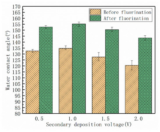 Figure 5 shows the WCA of the samples before and after fluorination treatment. The figure shows that, the average WCAs of SV0.5, SV1.0, SV1.5, and SV2.0 were 132.5°, 134.7°, 127.5°, and 120.5°, respectively. The surfaces of all the samples were hydrophobic before fluorination treatment. With the increase in the deposition voltage, the WCA of the samples was fluctuated slightly at this time, but the overall trend was downward. When the samples were fluorinated, the WCA was improved largely. The WCAs of FV0.5, FV1.0, FV1.5, and FV2.0 were 152.7°, 155.3°, 150.4°, and 143.5°, respectively. The WCA of all the samples exceeds 150 degrees except FV2.0.