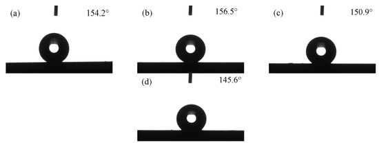 - Fluorination treatment is very important to improve the surface hydrophobicity of samples. After fluorination treatment, the WCAs of SV0.5, SV1.0, FV0.5, and FV1.0 reached 132.5°, 134.7°, 152.7°, and 155.3°, respectively. The rolling angles of FV0.5 and FV1.0 reached 8.6° and 6.5°, respectively. Superhydrophobic functions were obtained on the surface of FV0.5 and FV1.0.