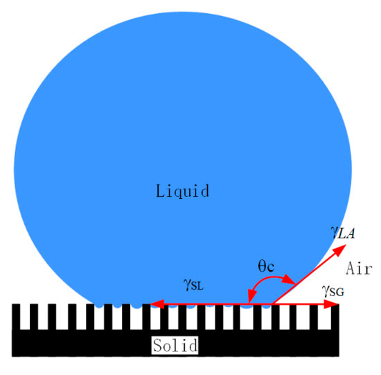 For superhydrophobic surface, the state of liquid-drop on solid surface accords with the Cassie-Baxter hydrophobic model [23]. In the Cassie-Baxter hydrophobic model, the contact surface between liquid-drop and solid is a composite contact surface, which is composed of liquid, solid, and air. Figure 7 is the schematic image of the Cassie-Baxter hydrophobic model. In the Figure 7,is the contact angle of rough surface, , are the surface tension of solid-air, liquid-air, and solid-liquid interface, respectively.