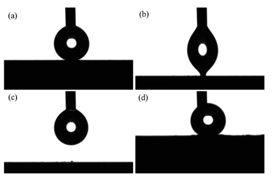 Figure 8 shows adhesion test of superhydrophobic sample to water-drop. The external diameter and internal diameter of the syringe needle used in this test were 0.52 mm and 0.26 mm, respectively. Because of the low adhesion of the superhydrophobic surface, it was difficult for the sample to attach the water-drop from the needle. When the water-drop contacted with the sample surface (Figure 8a), there was a small apparent solid-liquid contact. The water-drop cannot be attached by the sample surface, and the shape of the water-drop was approximately spherical. As the sample was pulled down gradually (Figure 8b), the shape of the water-drop was changed from the spherical shape to spindle shape due to the adhesion force of both the needle tip and the sample surface. With the further downward movement of the sample (Figure 8c), the water-drop finally broken away from the sample surface and bounced back from the spindle shape to the spherical shape. When the sample rose to a higher position (Figure 8d), due to the small adhesion force of the sample surface, the water-drop was squeezed by the sample surface and became deformed.