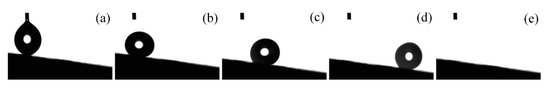 Figure 9 shows self-cleaning performance of superhydrophobic surface. As shown in Figure 9a–e, under the action of gravity, the water-drop fell on the superhydrophobic surface roll down directly. It showed that the superhydrophobic sample had good self-cleaning performance.
