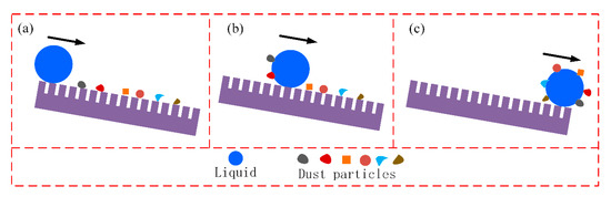 Schematic diagram of self-cleaning process of superhydrophobic surface: (a) water-drop fall on superhydrophobic surface with dust particles; (b) water-drop is rolling on superhydrophobic surface and adhere dust particles; (c) water-drop carry dust particles off superhydrophobic surface.