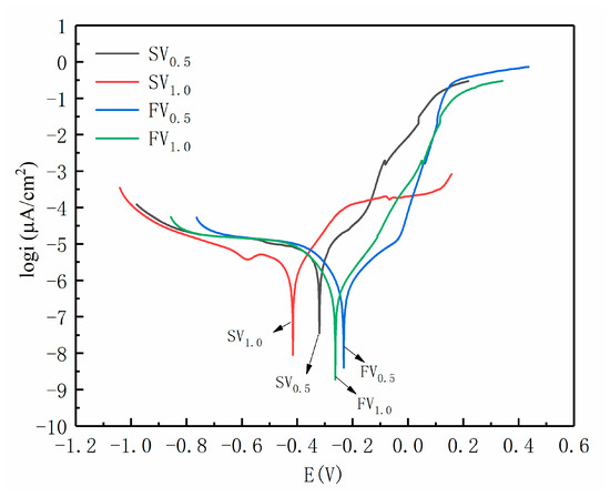 Figure 11 shows the polarization curves of the samples before and after superhydrophobic. Table 2 shows the corrosion parameters of different samples obtained from polarization curves. It can be seen from Table 2 that, before fluorination treatment, the corresponding corrosion current densities of SV0.5 and SV1.0 were 4.33 μA/cm2 and 2.07 μA/cm2, polarization resistances were 5.76 kΩ cm2 and 12.61 kΩ cm2, and corrosion rates were 54.78 μm/year and 25.04 μm/year, respectively. After fluorination treatment, the corresponding corrosion current densities of FV0.5 and FV1.0 decreased to 0.87 μA/cm2 and 0.79 μA/cm2, polarization resistances increased to 29.04 kΩ cm2 and 32.85 kΩ cm2, corrosion rates decreased to 10.28 μm/year and 9.34 μm/year, respectively.