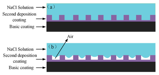 Schematic diagram of the surface state of the sample in NaCl solution: (a) Non-superhydrophobic sample (b) Superhydrophobic sample.