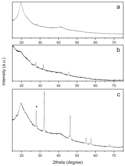 The XRD patterns of pure PVA film (a), PVA/LiCl electrolytic film (b) and PVA/AgNO3 electrolytic film (c).