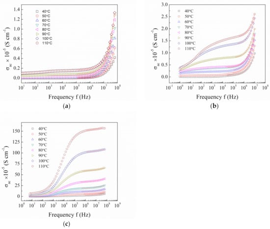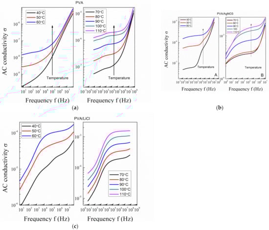 The frequency dependent of ac conductivity of the PVA (a), PVA/LiCl film (b) and PVA/AgNO3 films (c) at different temperatures from (40–110 °C).