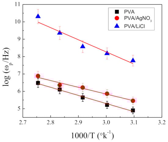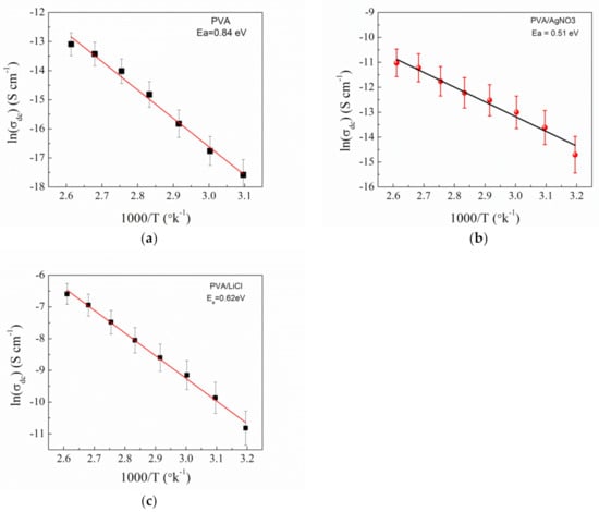 On the other hand, the values of σdc are listed in Table 2, in which they also follow the order PVA/AgNO3 > PVA/LiCl > PVA. By plotting ln(σdc) against (1000/T) as shown in Figure 6a–c, the activation energy Ea could be obtained for samples according to the relation;