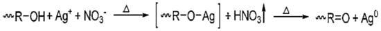 The reduction of AgNO3 to Ag atoms by using the reactive PVA polymer at hot conditions.