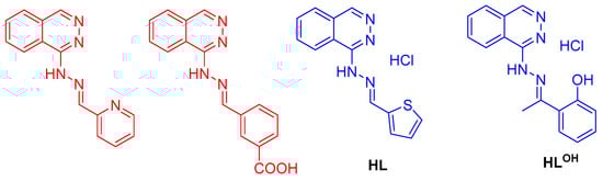 Structure of the studied hydralazine-based ligands; red color: previously reported ligand [15,57]; blue color: new ligands.