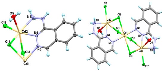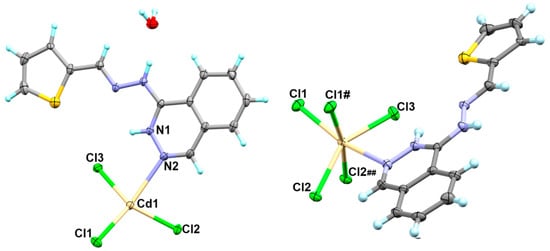 The [Cd(H2L)Cl3]n*H2O complex (1) crystallized in the triclinic crystal system and the primitive P-1 space group. The hydrazonophthalazine ligand was found protonated either at the hydrazono or phthalazine N-atoms during the course of preparation while the other N-site of the phthalazine moiety was found coordinated with the Cd(II) ion with a relatively long Cd1-N2 bond (2.773(4) Å). The asymmetric unit of 1 comprised one protonated organic H2L+ molecule as a cationic monodentate ligand and three coordinated chloride anions as an anionic ligand (Figure 3; left part).