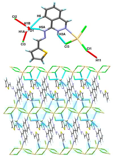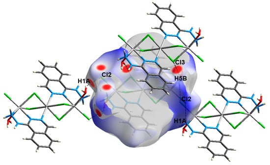 The most important contacts as concluded from the Hirshfeld surface analysis shared in molecular packing of complex 3 are shown in Figure 14. It is clear that the Cl…H and O…H contacts are the most important ones. Many dark red spots in the decomposed dnorm map are corresponding to the Cl…H contacts. Moreover, two sharp spikes in the corresponding decomposed fingerprint plot are provide strong evidence to support the importance of these intermolecular interactions. The percentage of the Cl…H interactions is 43.5% and the shortest contact distances are 2.302, 2.376, and 2.461 Å for the Cl3…H5B, Cl2…H5A, and Cl2…H1A, respectively. Pictorial presentation of O-H…Cl and N-H…Cl hydrogen bonding interactions is shown in Figure 15. Moreover, the O…H contacts appeared to be important. This occurred between one proton from the amino group of the hydrazine moiety as hydrogen bond donor and the oxygen atom from the water molecule as hydrogen bond acceptor. The shortest O…H contact distance is 2.292 Å for the O5…H1B which corresponds to the N1-H1B…O5 hydrogen bond.