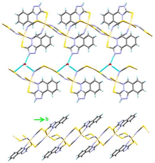 In this complex, the μ(1,3) thiocyanate groups connect the Cd(II) centers, leading the 1D coordination polymer to extend along the crystallographic b-direction, as shown in the lower part of Figure 7. It is clear from the upper part of this figure that the crystal water molecules are located between the 1D chains and connecting the polymer chains via N-H…O, O-H…N, and O-H…S hydrogen bonding interactions, leading to a 2D supramolecular structure. A list of the hydrogen bond parameters is given in Table 5.