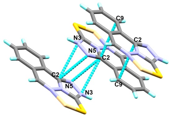 In addition, the organic ligand units in the adjacent complex molecules are stacked together by the weak π-π stacking interactions shown in Figure 8. The shortest contacts are shown in this figure as a turquoise dotted line with interaction distances of 3.342(6) Å, 3.240(6) Å, and 3.173(5) Å for C2…C9, C2…N3, and C2…N5, respectively.