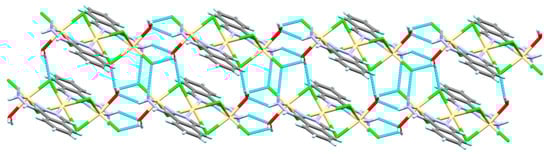 It is clear that the structure comprised of discrete trinuclear Cd(II) complex and hence 3 could not be described as a coordination polymer. The trinuclear complex units are connected by a complicated set of N-H…Cl, N-H…O and O-H…Cl hydrogen bonding interactions with donor-acceptor distances of 3.464(7), 3.047(7) and 3.093(6)–3.227(5) Å, respectively (Table 7). A pictorial presentation of the two-dimensional hydrogen bonding network showing the molecular packing of the complex units is shown in Figure 10.